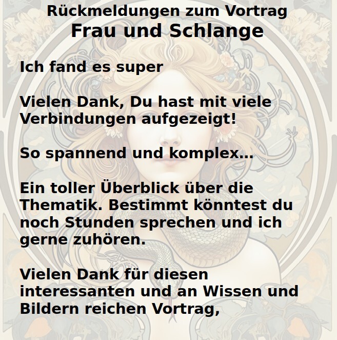 Die tiefe Verbindung der Schlange zur Frau, oder in der Überhöhung zur Göttin, ist ein Mythos, der weltweit anzutreffen ist. Im Christentum geht mit der Verschiebung der Schlange zum Symbol des Bösen auch die Degradierung der Frau einher. Beide Archetypen scheinen auf das innigste Verbunden zu sein. Woher kommt diese Verbindung und was meint sie?